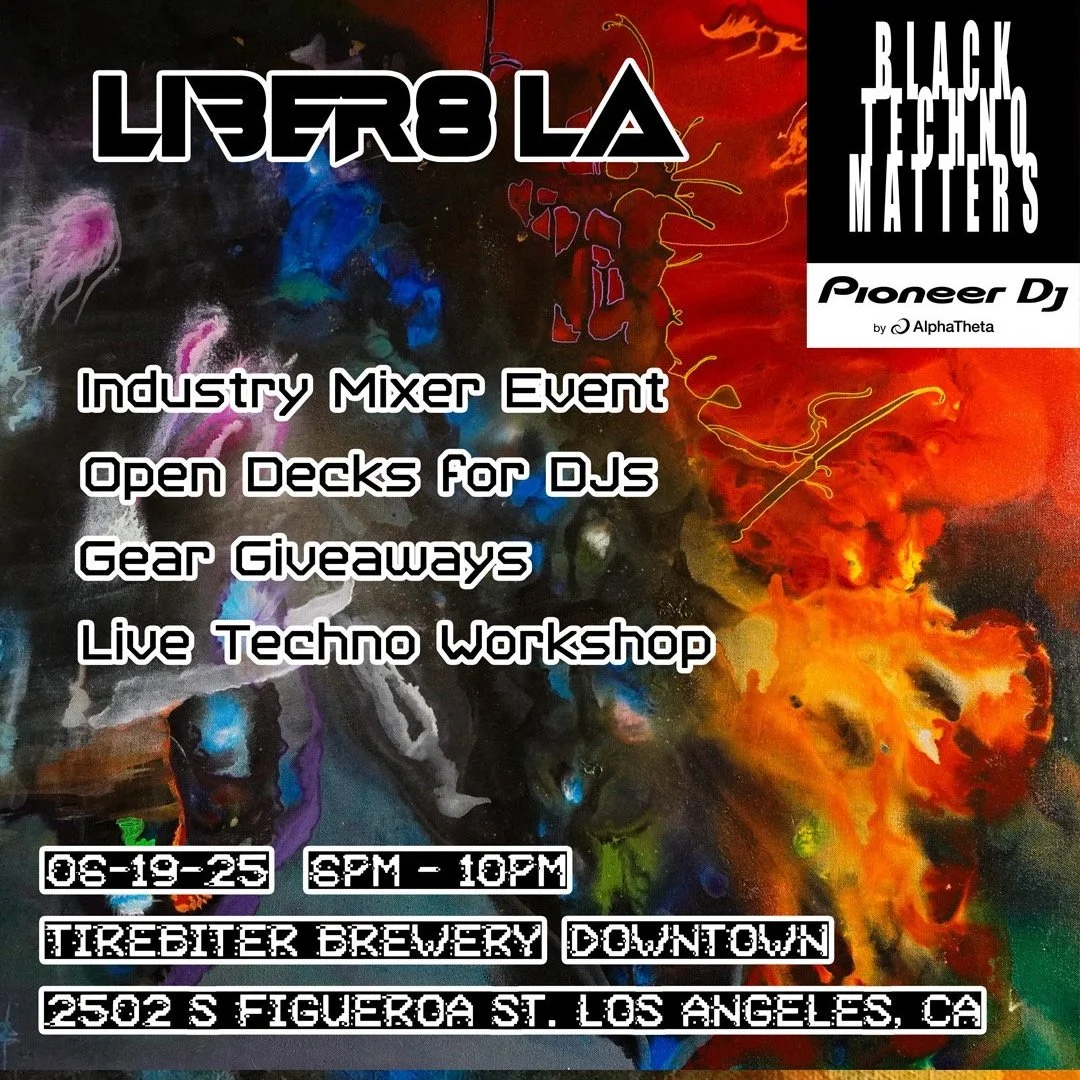 The day after the BLACK TECHNO MATTERS LIBER8 LA party in Chinatown we’re having an industry mixer event in partnership with Pioneer DJ to get to know the community and give opportunities for new talent. Trovarsi will be hosting workshops focused on live performance and we will be doing a giveaway from Pioneer for some FREE gear. This is an open decks event, so bring your USBs to hop on and set the vibe. It’s happening at Tirebiter Brewery in Downtown on June 19th to celebrate Juneteenth. Hope to see you there!