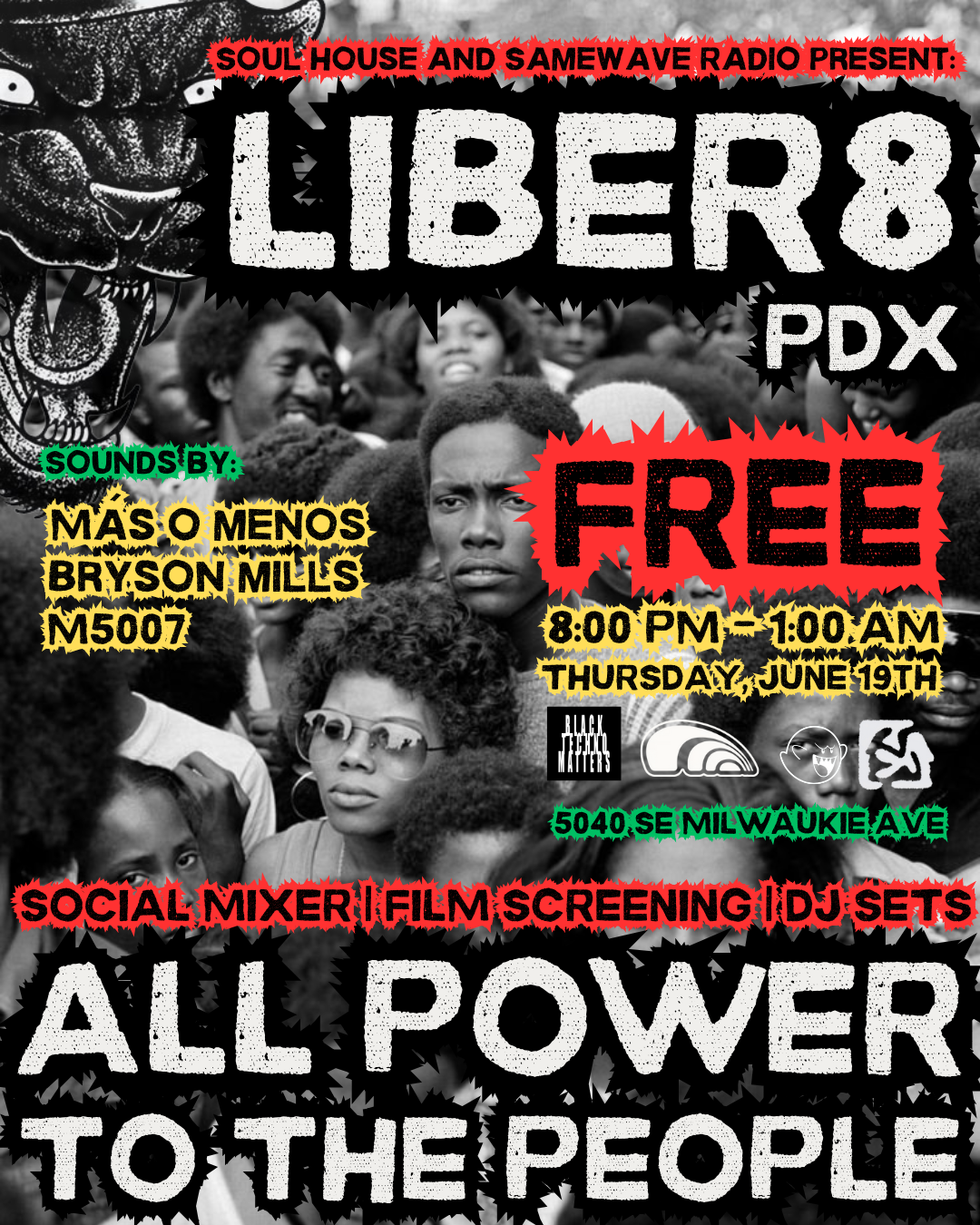 SOUL HOUSE and SAMEWAVE RADIO are ecstatic to bring you a FREE Juneteenth celebration! We’re joining the amazing folks at BLACK TECHNO MATERS to bring you a second year of LIBER8 PDX.