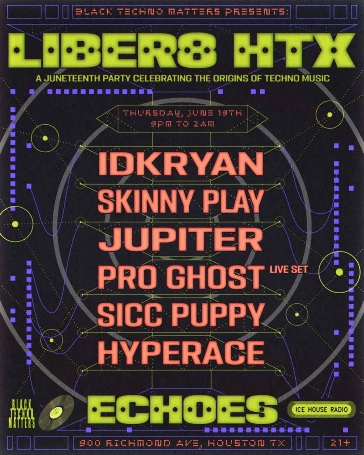 Liber8 HTX marks the latest addition to Black Techno Matters’ Liber8 US event series—a multi-city Juneteenth celebration of techno’s Black origins, pioneers, and innovators. In step with BTM’s mission, Liber8 HTX invites Houston’s techno heads to celebrate the genre’s roots and the South’s impact on dance music.