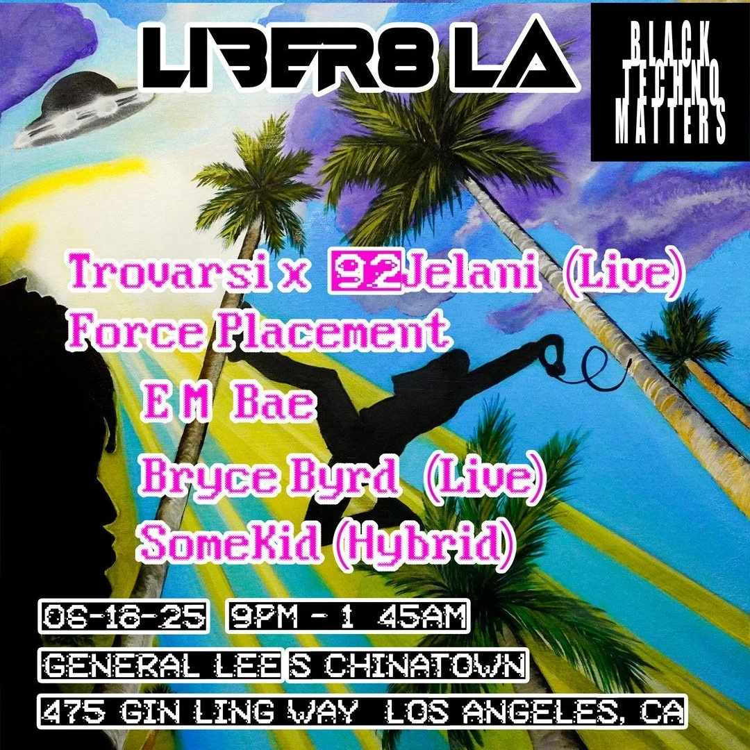We're excited to announce the lineup for this year’s BLACK TECHNO MATTERS LIBER8 LA juneteenth event! This year we have FORCE PLACEMENT, BRYCE BYRD (live set) SOMEKID (hyrbid set) and also for the first time ever, a live set b2b with TROVARSI and 92JELANI. This will be FREE all night at General Lee’s in Chinatown LA. We hope to see you there!