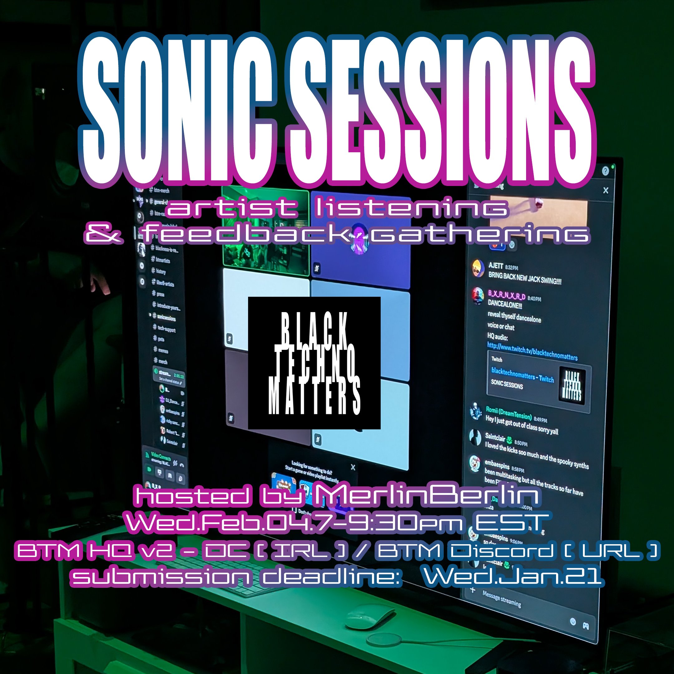 Sonic Sessions is BACK—we’re giving live feedback on demos for our first session of the year on Wednesday, February 4! You’re invited to send in an original, unreleased track that will be heard in an intimate setting by other artists and the Black Techno Matters label team themselves, followed by thoughtful discussion on your track.